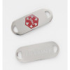 Pre-engraved "PACEMAKER" stainless steel medical ID tag with red caduceus. Tag Measures 1.5" Across and .5" High. Engraving is on back of the tag.